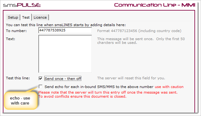 smsPULSE MM employs Communication Lines documents to control the lines which are active on your server. Please note that the HTTPS channel does not require a Communication Line document and is "built-in" to smsPULSE. Future releases of smsPULSE will include new types of Communication Lines. A sample Communication Line document: Web UI: Echo From version 7.6.2 you can ask smsPULSE to send you a text message for every text message that comes in. This is useful during test or pilot times and we recommend that you turn these features off once you are in production mode. When Echo is ON and you check the status of smsLINES, the following confirms the feature: Notes UI: Testing a line Once the server is connected to a line you may test it. To do so click on the Test tab and fill in the details, not forgetting to tick the "Send once..." checkbox: You may also test a line after the above form is filled by typing the following command on the Domino console: "tell smslines test n" (where n is the line number). Please note that if you added the number after smsLINES has loaded you will need to restart smsLINES for the number to be read. To restart smsLINES just type: "tell smslines restart" Licensing a line If you bought an smsPULSE DM license or an smsPULSE MM license you will need to license each line you have purchased. For instructions please click here .