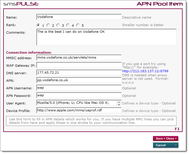 smsPULSE Allows you to store APN details so that these can be used by MMS Communication lines. You will find that getting the correct APN details in some countries may be tricky and you will want to save these details outside actual Communication Line records. This applies to MMS lines only. Web UI: And in the sms.ADMIN database you will find the following: Open an APN document to see the details you have saved: And in the Notes UI: Once you have built an APN pool, and you are working on MMS Communication Lines, use the pool to set your APN details in one stroke: The result: Same feature available when using the Notes client.
